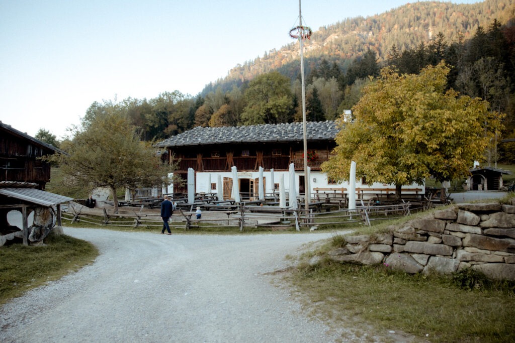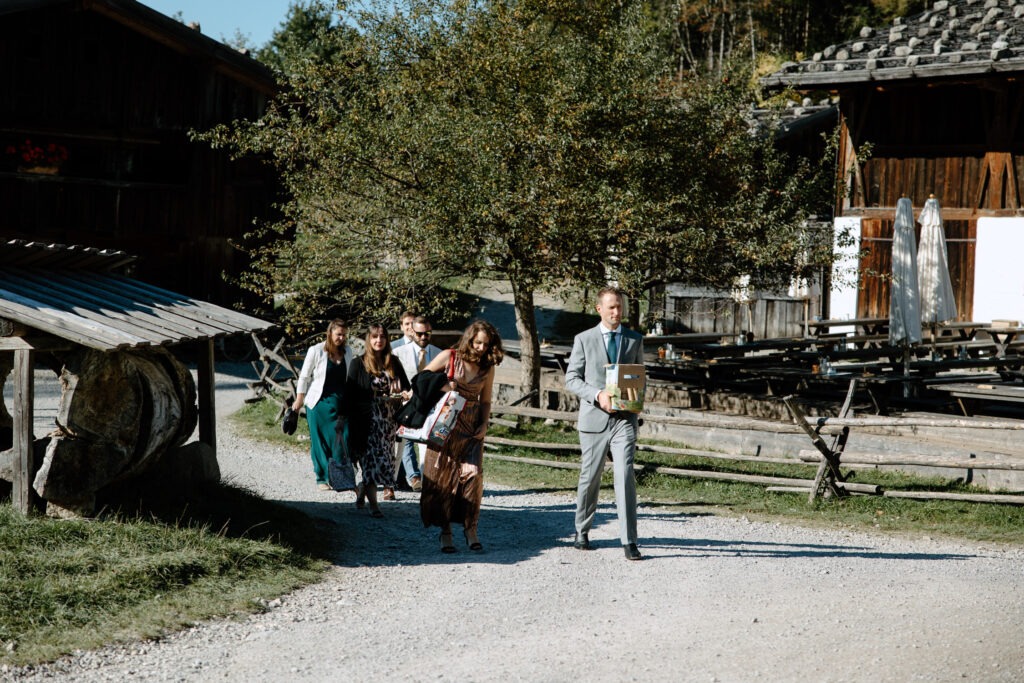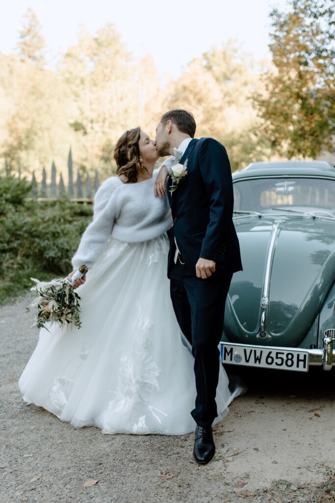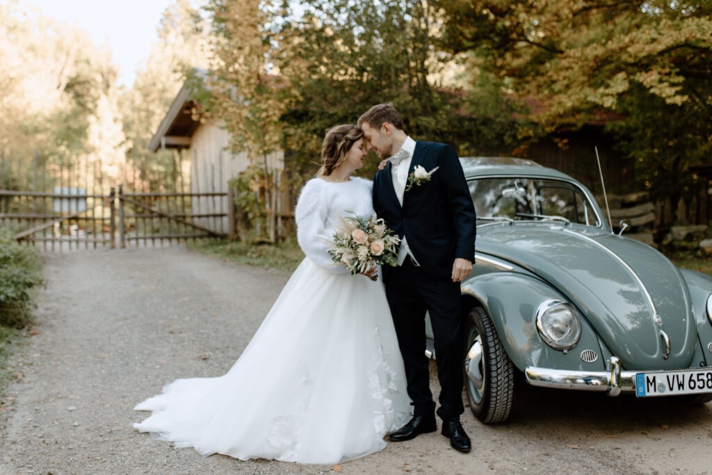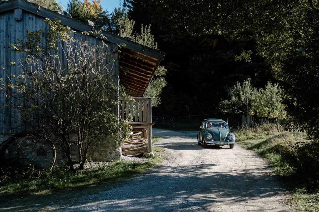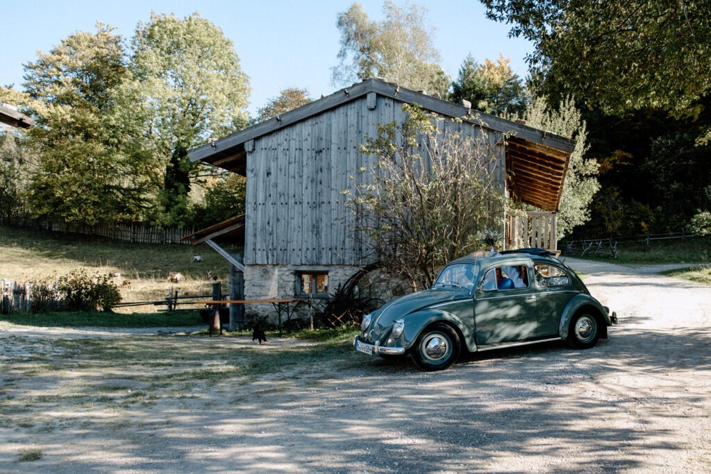 Nach der Zeremonie fuhr das Brautpaar in einem nostalgischen VW Käfer zum Freilichtmuseum Markus Wasmeier, wo die Feier stattfand.