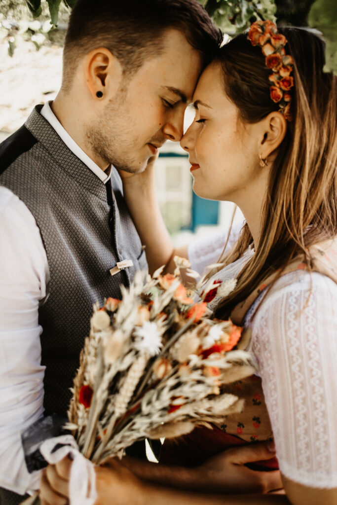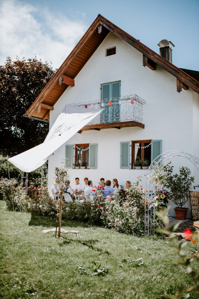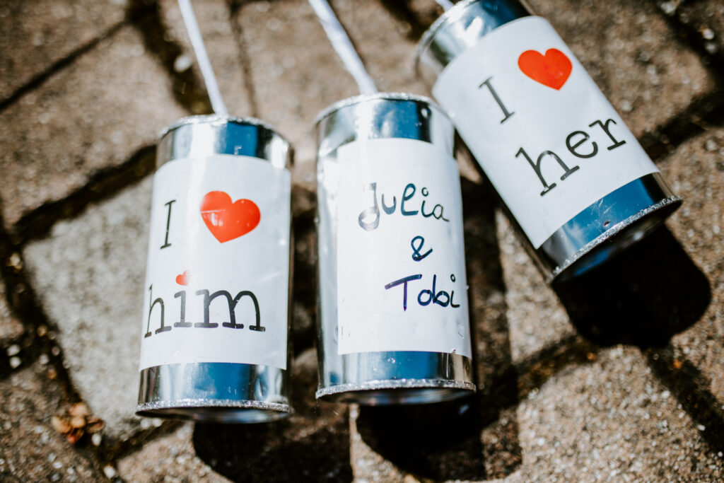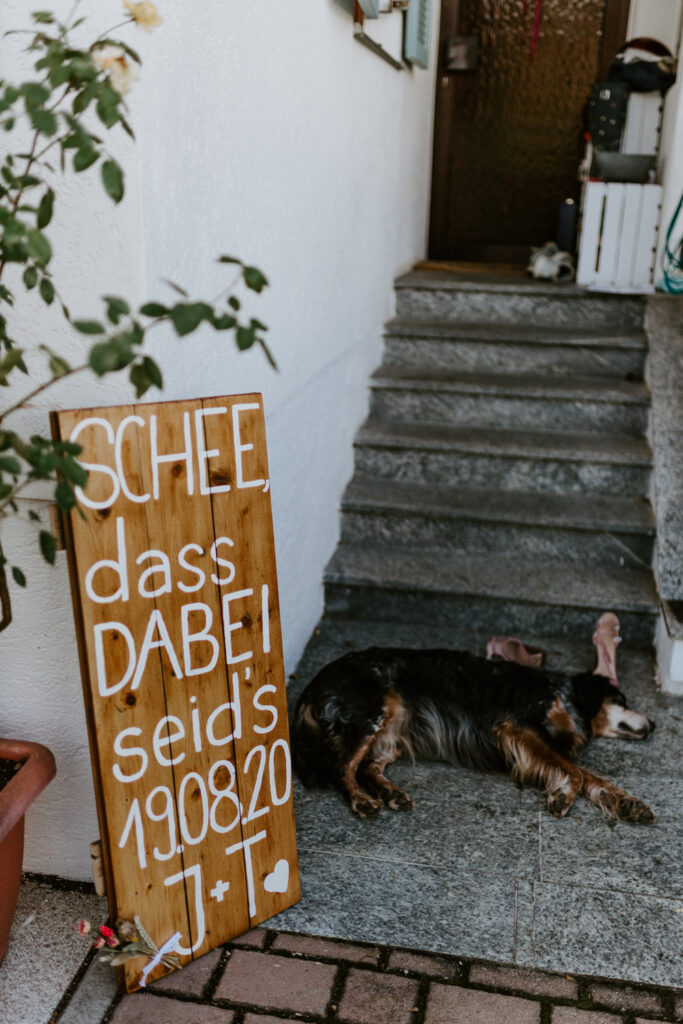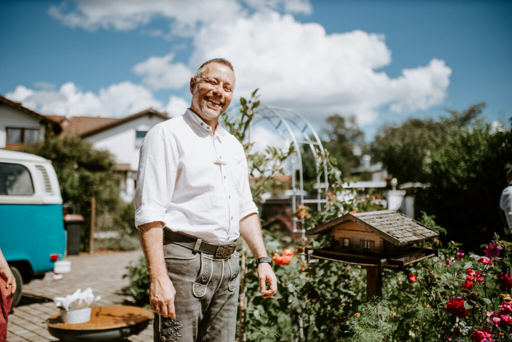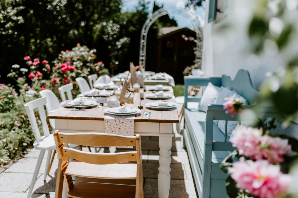 Die Brautpaarfotos konnten wir direkt in der Umgebung machen. Coronabedingt fand die Feier im eigenen Garten von Julia und Tobias statt, der ganz liebevoll dekoriert war.