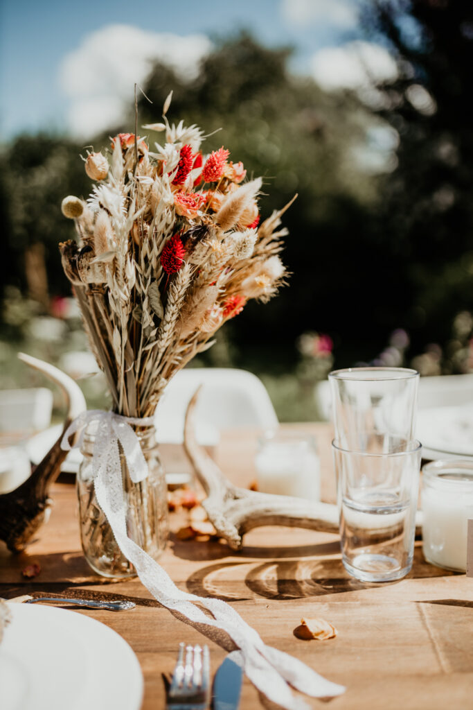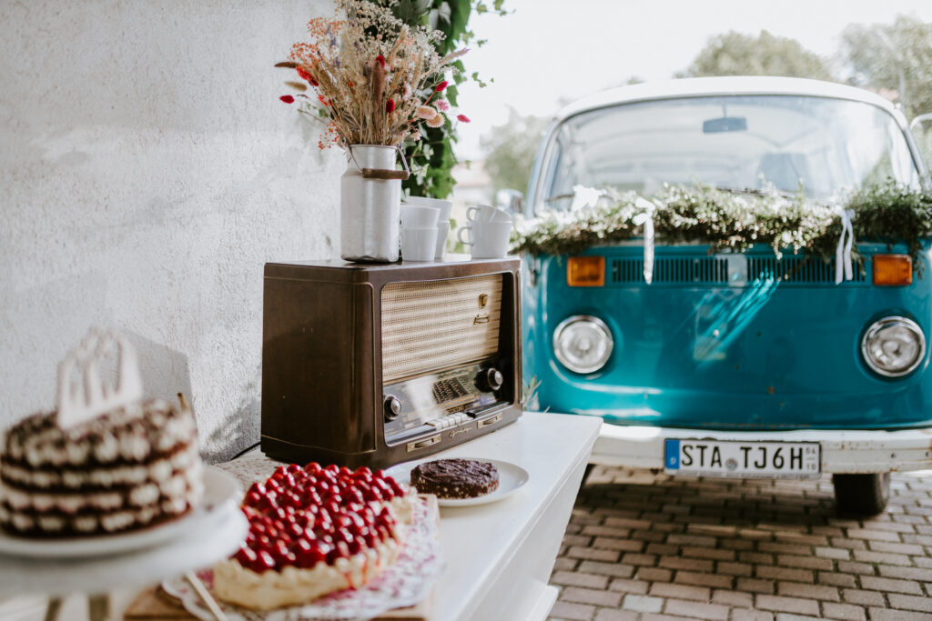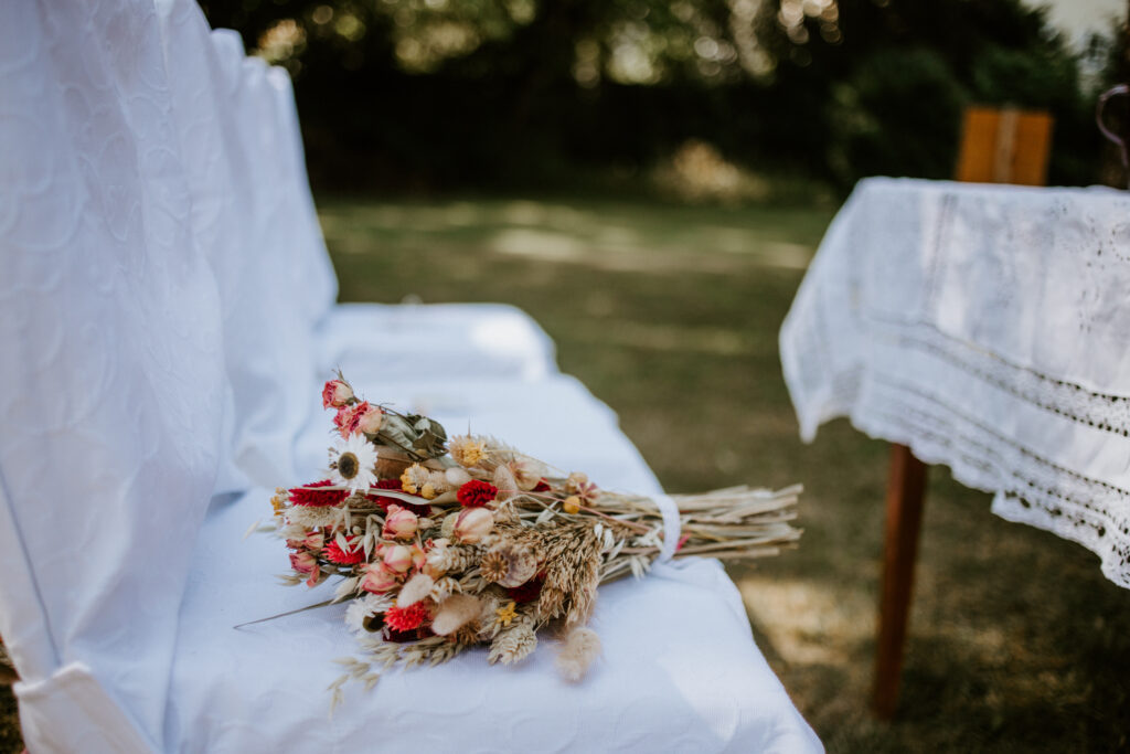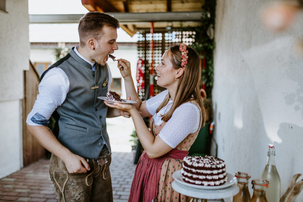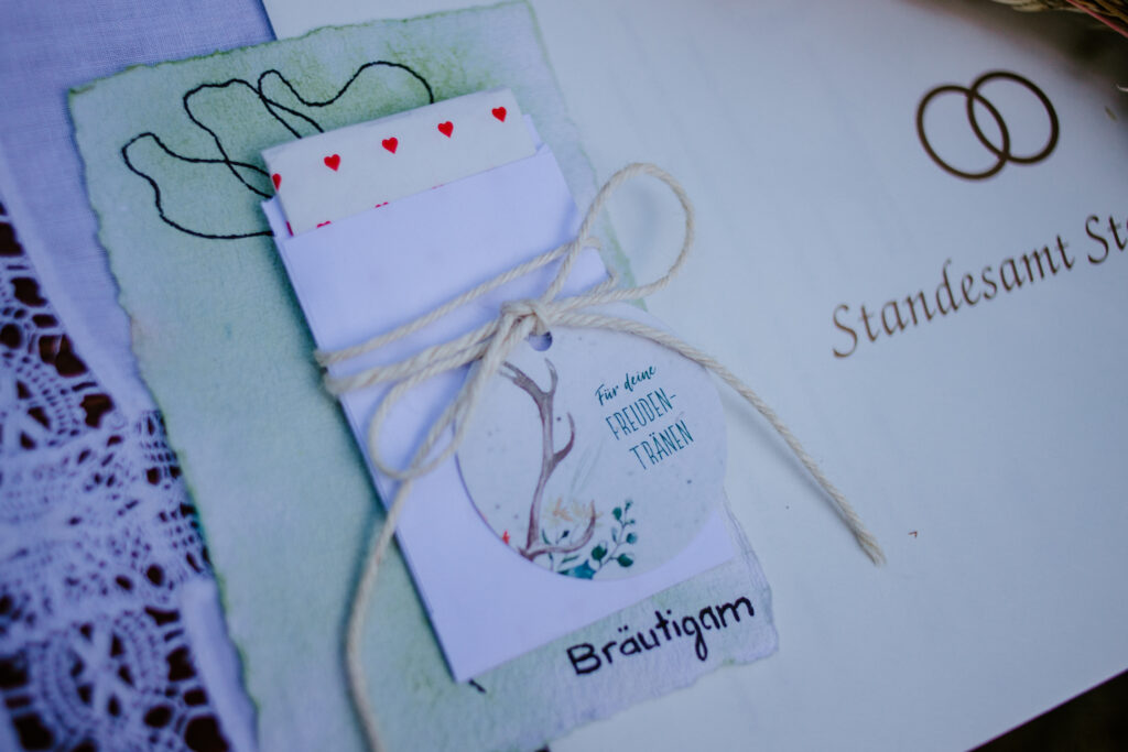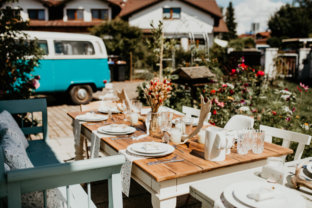 Die Brautpaarfotos konnten wir direkt in der Umgebung machen. Coronabedingt fand die Feier im eigenen Garten von Julia und Tobias statt, der ganz liebevoll dekoriert war.