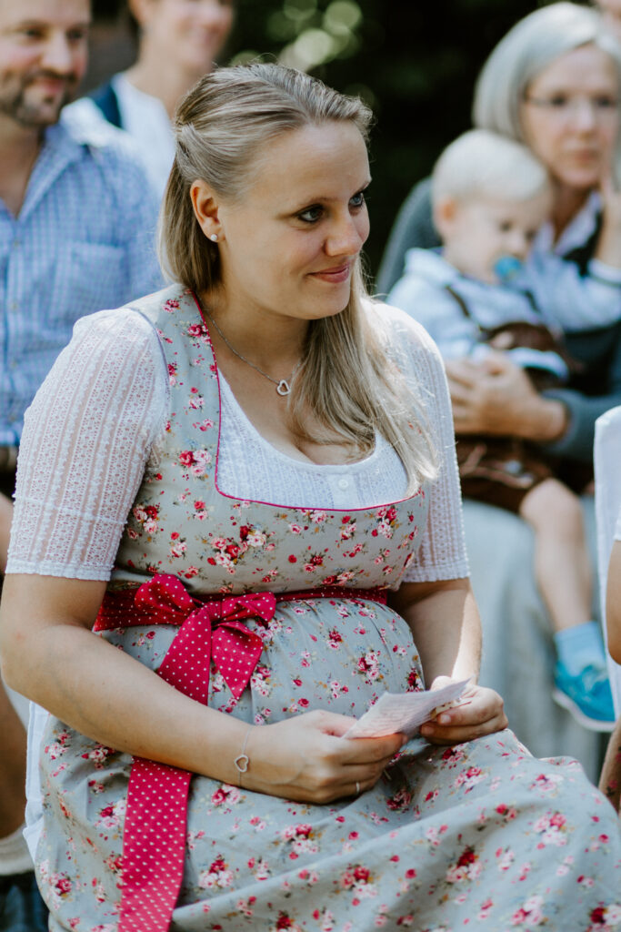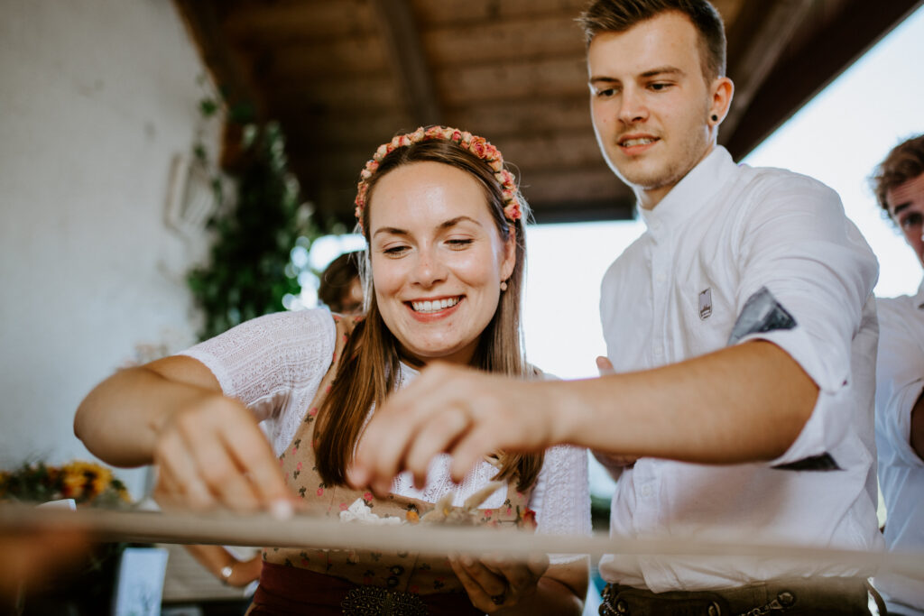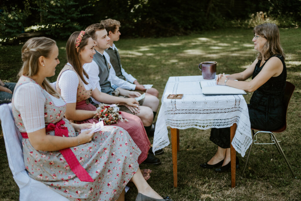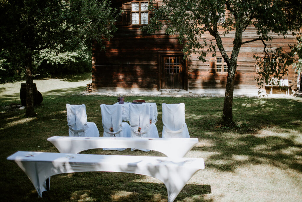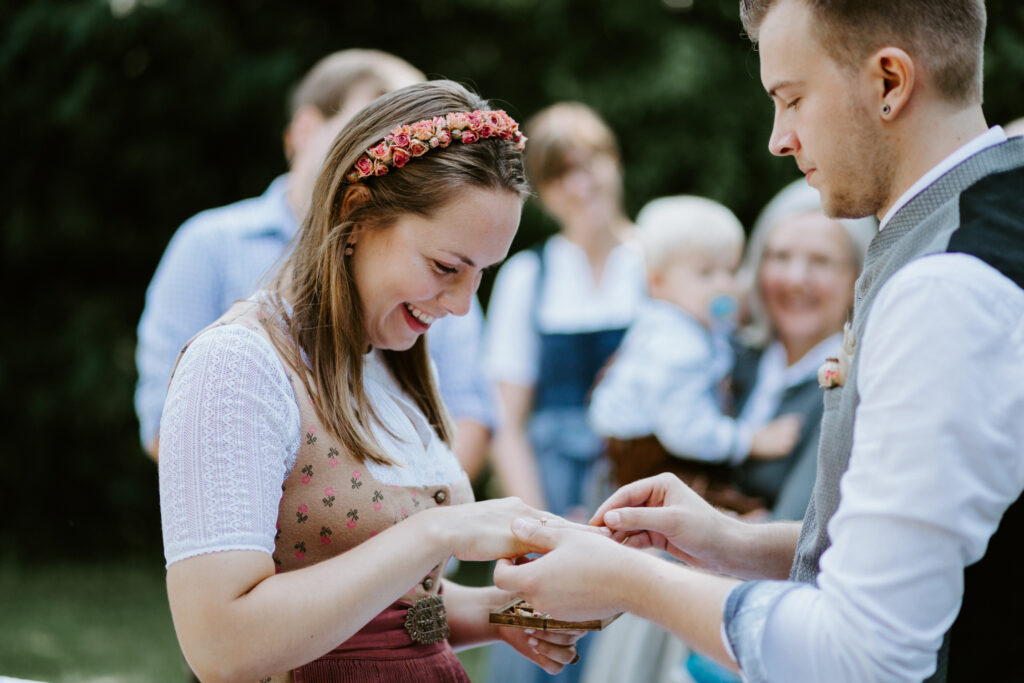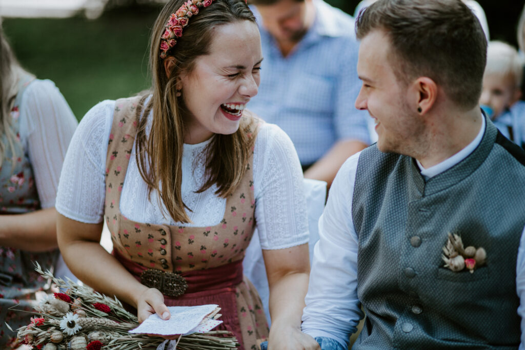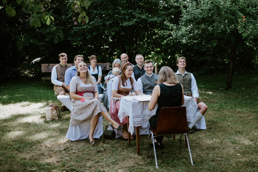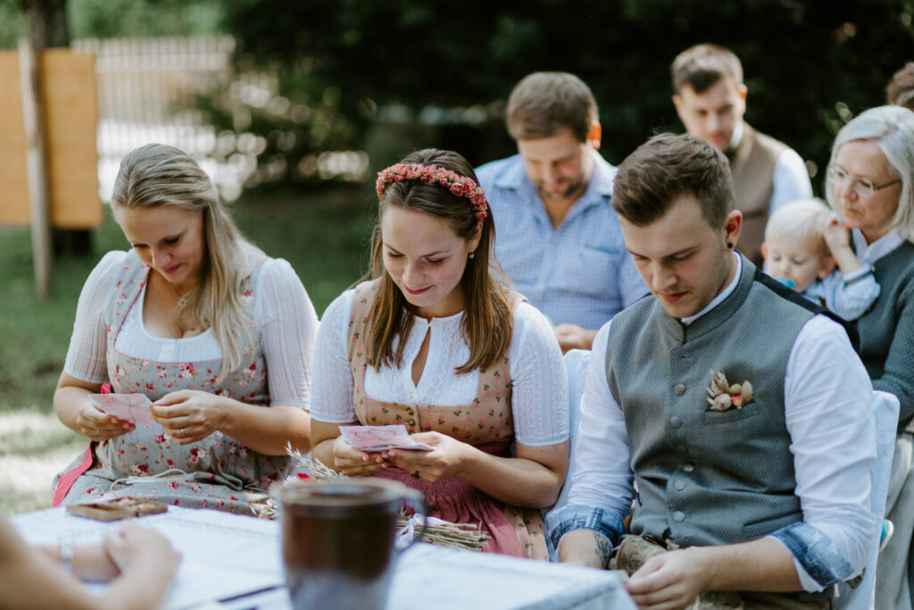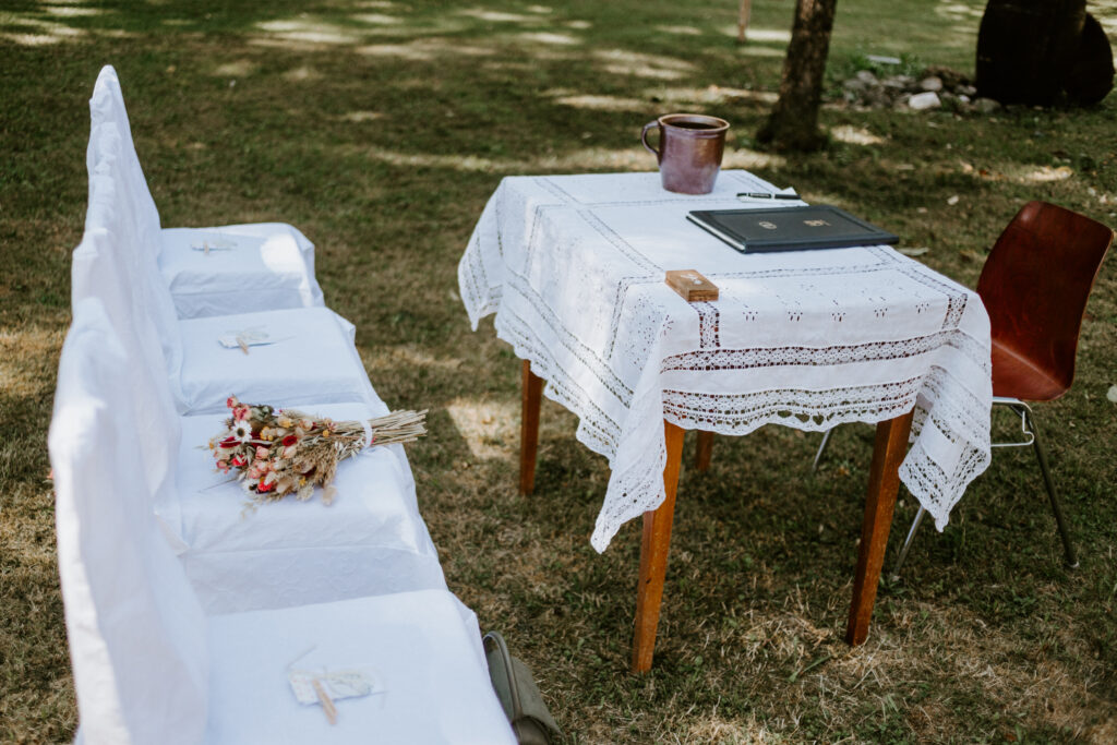 Hier gaben sich die beiden im idyllischen Garten unter dem Apfelbaum das Ja-Wort. Für das Eheversprechen haben sich Julia und Tobias etwas besonderes einfallen lassen, sie haben sich gegenseitig einen Brief mit persönlichen Worten geschrieben, den sie für sich selbst während der Trauung durchlasen. Außerdem hat jeder Gast auch einen eigenen persönlichen Brief vom Brautpaar erhalten.